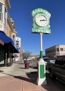 The clock — original manufactured by Brown Street Clock Company of Monessen, Pennsylvania — was first installed by jewelry store owner R.G. Gordon in the late 1920s, according to historical information provided by the Las Vegas New Mexico Community Foundation. The jewelry store was later purchased by Calvin Baker Sr. and his wife Alnita, and the clock bearing the Gordon’s Jewelry name continued to greet customers for decades.