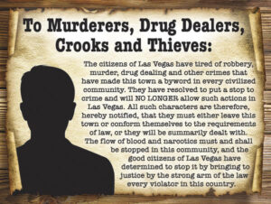 “The citizens of Las Vegas have tired of robbery, murder, drug dealing and other crimes that have made this town a byword in every civilized community. They have resolved to put a stop to crime and will NO LONGER allow such actions in Las Vegas.”